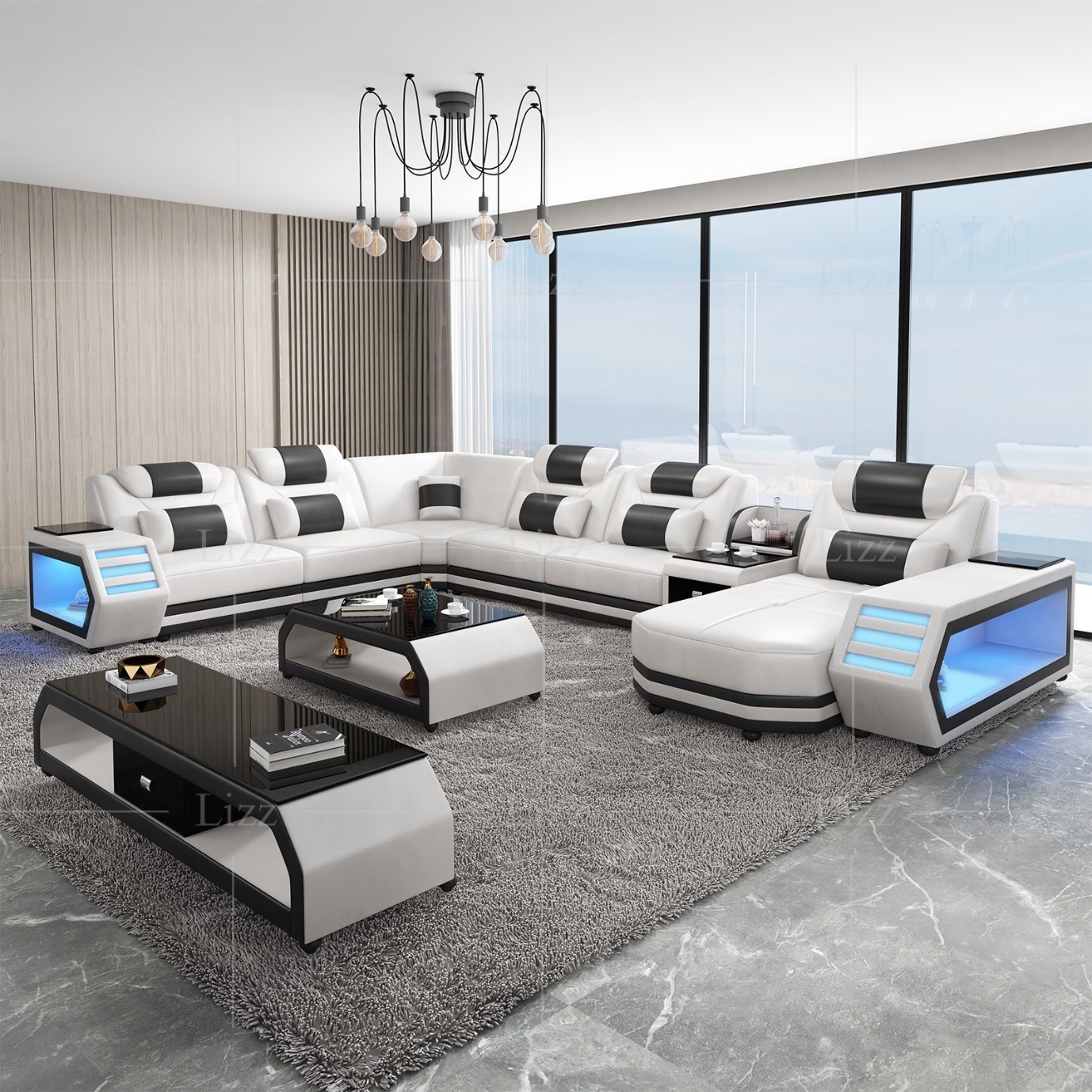 Functional LED Modern European Design Leisure Genuine Leather Sectional Sofa