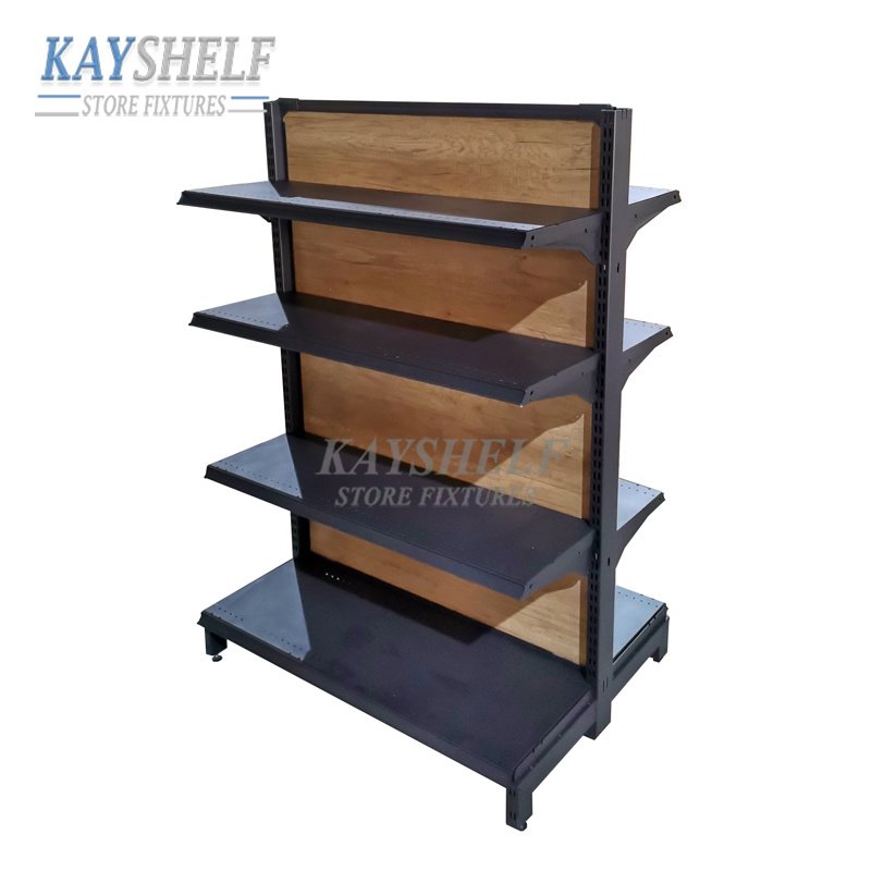 Double Sided Wooden Panel Retail Display Shelves Supermarket Gondola Rack