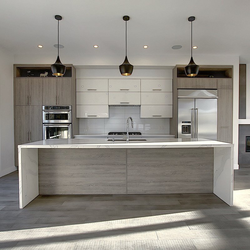 Modern Kitchen Cupboard White Gloss and Wood Grain Laminated Kitchen Cabinet 2023 N